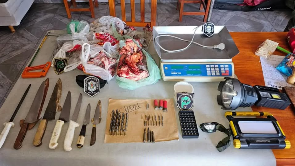 Durante el allanamiento se secuestraron 15 kilos de cortes cárnicos ovinos, elementos de faena, balanza, y municiones de diferentes calibres.